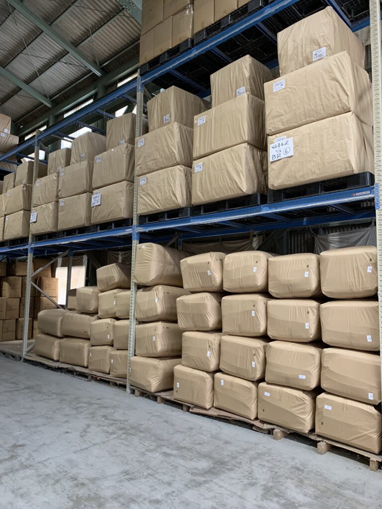 マットレスなどの梱包後の形状が安定しているものは、積み上げて保管ラックの上段においても問題なく収納可能との事。
